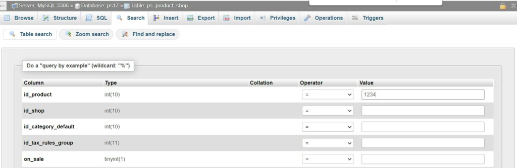 Then open the database in PhpMyAdmin interface and go to the product_shop table. Click on the “Search” tab, enter the product ID and validate.