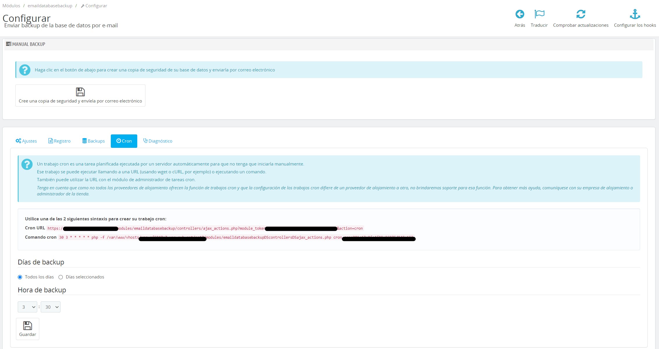 Utilice la información proporcionada por el módulo para configurar una «cron task» programada (desde su servidor, su alojamiento o un servicio gratuito comoEasyCronpor ejemplo) que se encargará de activar el creación de la copia de seguridad.