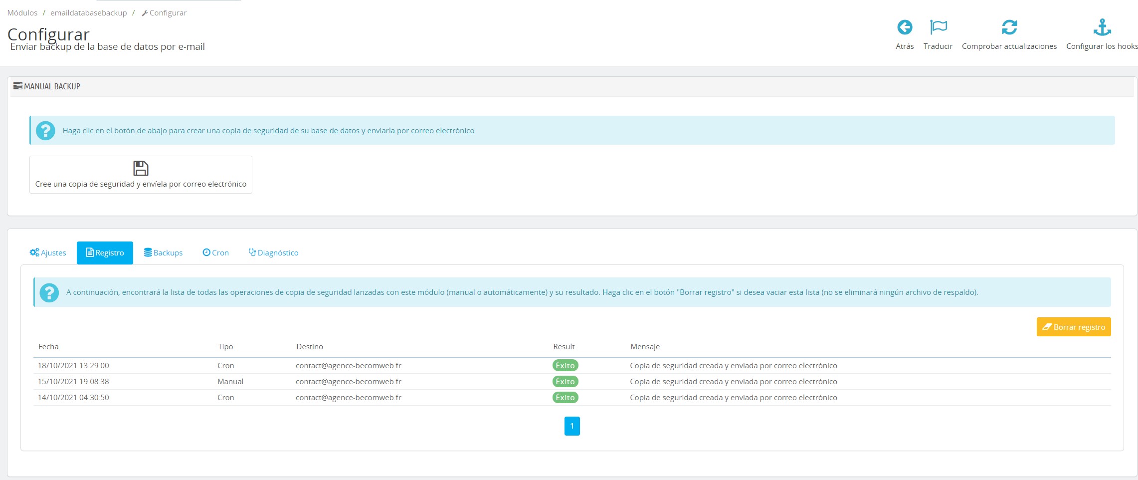 Este módulo le permite configurar el envío automático de una copia de seguridad de la base de datos de su sitio Prestashop a su dirección de correo electrónico.