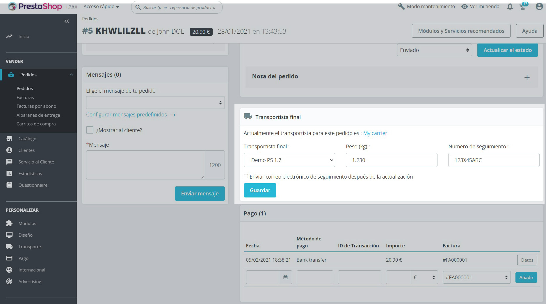 Ahora, gracias a este módulo, podrás cambiar el transportista, el peso del pedido y su número de seguimiento desde el back office de Prestashop.