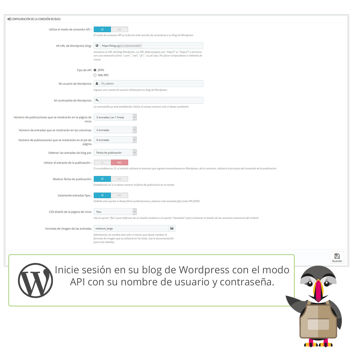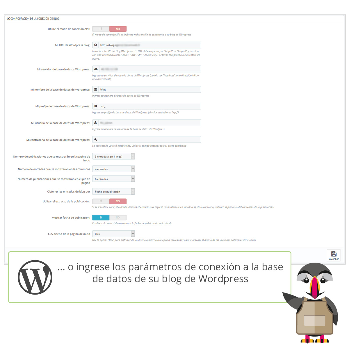 Para conectar su tienda y su blog, nada podría ser más simple. Aquí no hay que hacer ninguna modificación compleja en el código, todo se hace desde la página de configuración del módulo. Todo lo que tiene que hacer es ingresar la URL del sitio de WordPress y la configuración de su cuenta de usuario (nombre de usuario y contraseña), y ya está.
