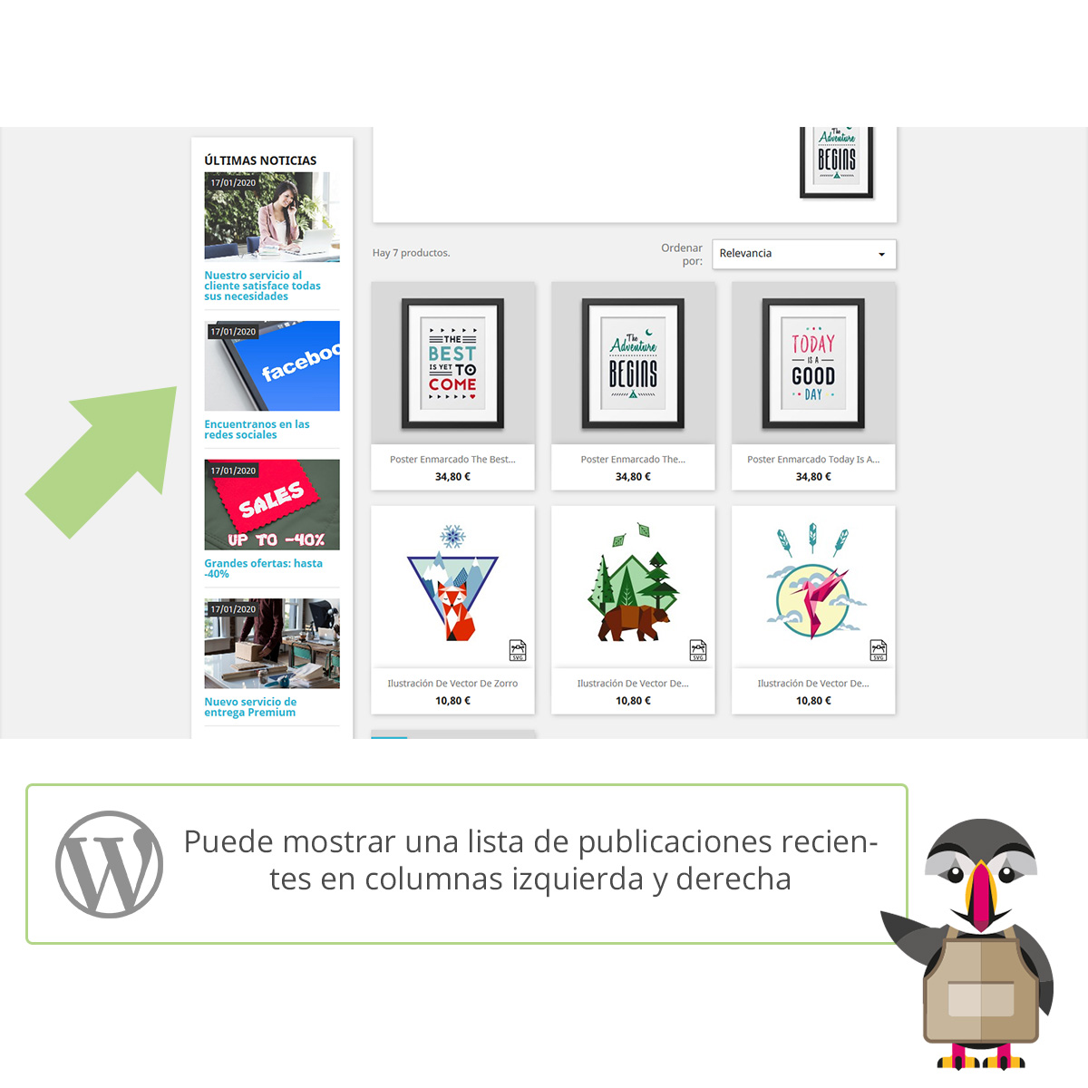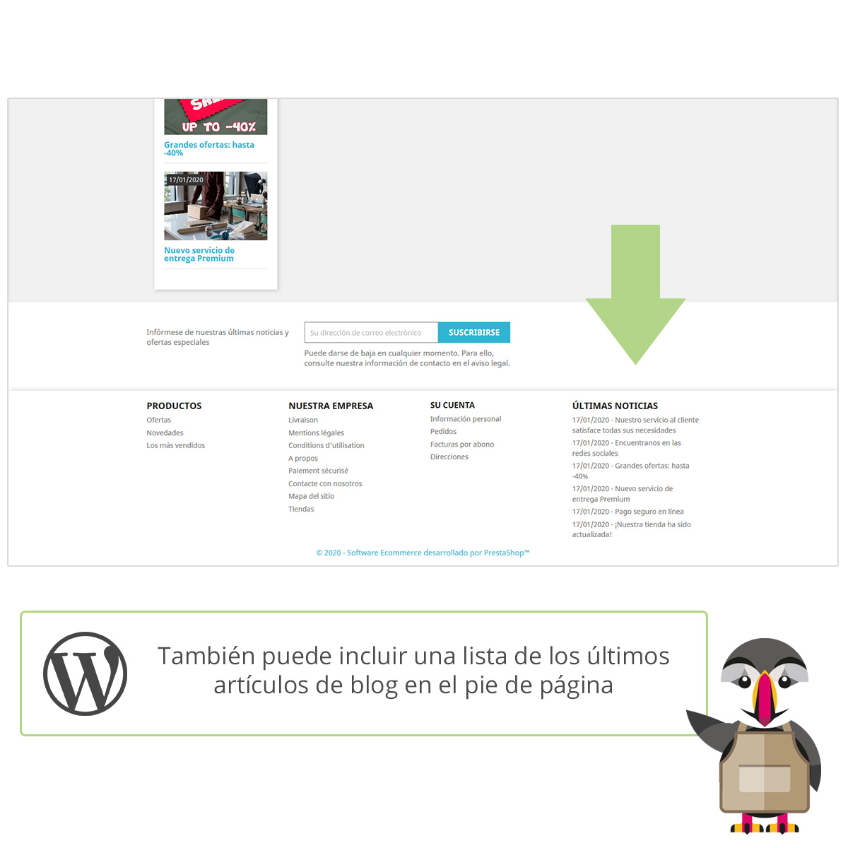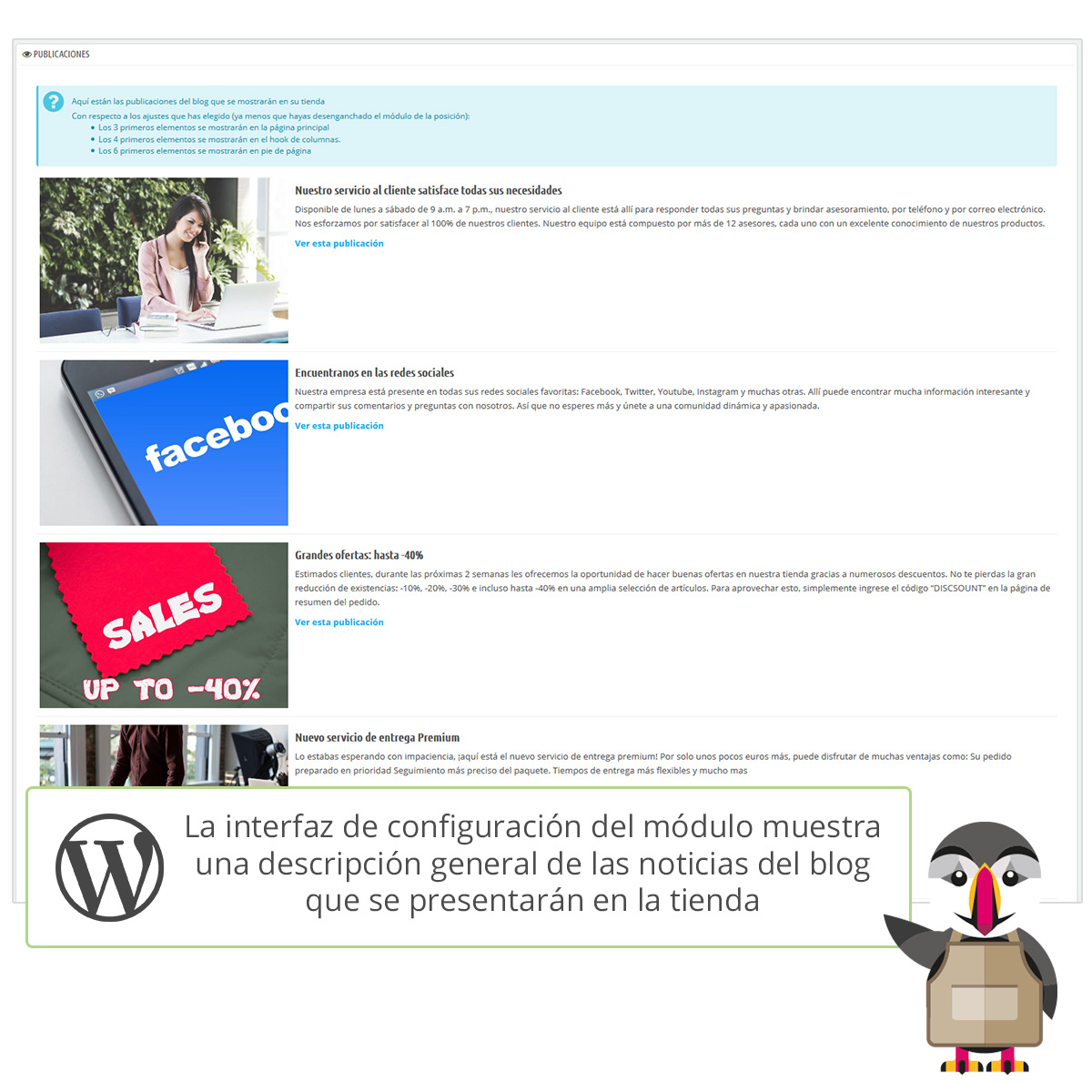 El módulo Mis noticias WordPress te permite integrar el contenido de tu blog en diferentes lugares de tu tienda: página de inicio, columnas y pie de página. Para cada uno de estos ganchos, puede decidir la cantidad de noticias que se mostrarán.