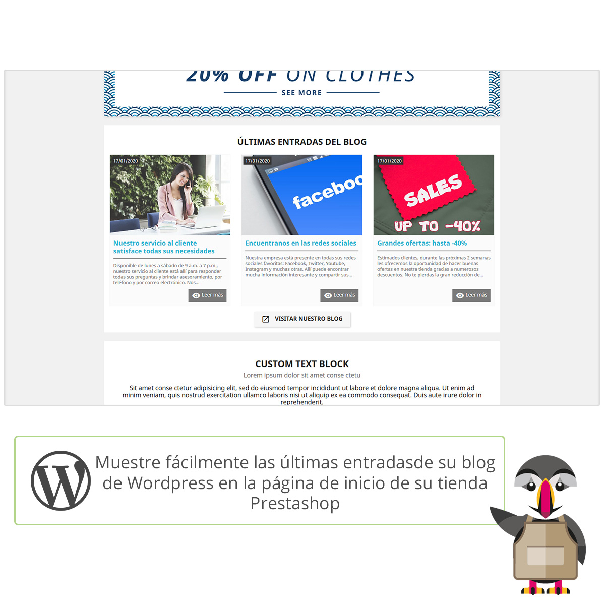 ¿Tiene un sitio de Prestashop & un blog diseñado con WordPress y desea vincularlos para poder mostrar las últimas noticias dentro de la tienda? Entonces este módulo es para ti.